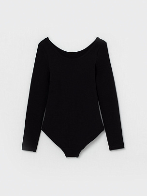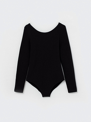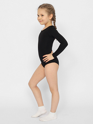 Купальник гимнастический с длинным рукавом. Вырез горловины и проймы ножек окантованы бейкой из основного полотна.