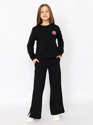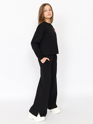 Стильный костюм оверсайз (свободный крой) состоит из 2-х предметов: укороченный свитшот и брюки-палаццо. Свитшот декорирован ярким объемным пафф-принтом "Свободный художник". Брюки-палаццо с завышенной талией и расклешенные снизу. Элементы костюма можно носить как самостоятельные вещи.