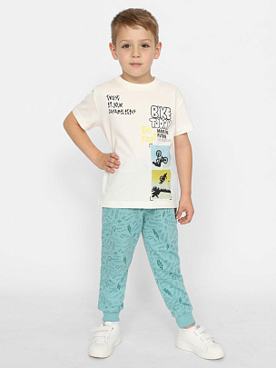 Футболка для мальчика с короткими рукавами и принтом спереди. Горловина круглая, обработана притачным воротником из полотна с эластаном.