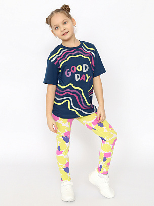 Трикотажная футболка оверсайз для девочки выполнена из мягкого хлопкового трикотажа. Свободный силуэт с заниженной линией плеча не сковывает движения. Модель дополнена круглым вырезом горловины и короткими рукавами. Перед декорирован ярким принтом с блестящим эффектом (надпись: Хорошего дня). Мягкие и комфортные лосины средней посадки с поясом на резинке.