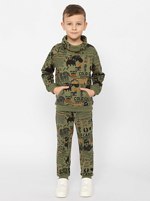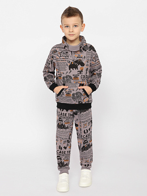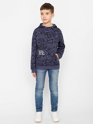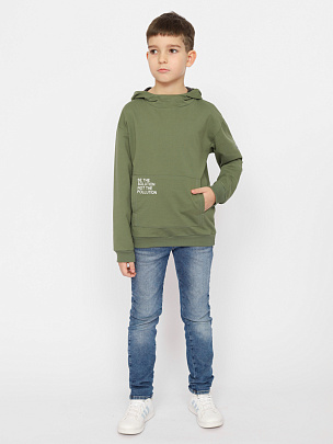 Джемпер для мальчика свободного силуэта с карманом спереди и притачным эластичным поясом по низу. Горловина круглая, обработана притачным воротником из полотна с эластаном. Рукава длинные с эластичными манжетами по низу. Перед джемпера декорирован принтом "Маленькие шаги приводят к большим переменам".
