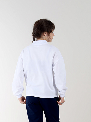 Джемпер-поло из пике для девочки, с длинными объемными рукавами, свободного силуэта, спущенным плечом и отложным воротником. Спереди застежка на пуговицы. Спереди декорирован вышивкой.