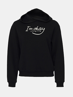 Толстовка для девушки с капюшоном и длинными рукавами из плотного трикотажа без начеса. Рукава с манжетами по низу. Притачной пояс и манжеты выполнены из полотна с эластаном. Перед толстовки декорирован принтом (я в порядке).