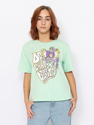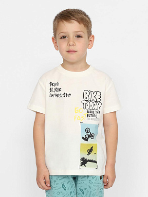 Футболка прямого силуэта с короткими рукавами. Горловина круглая, обработана притачной бейкой из рибаны с лайкрой. Перед футболки декорирован блестящим принтом, имитирующим пайетки.